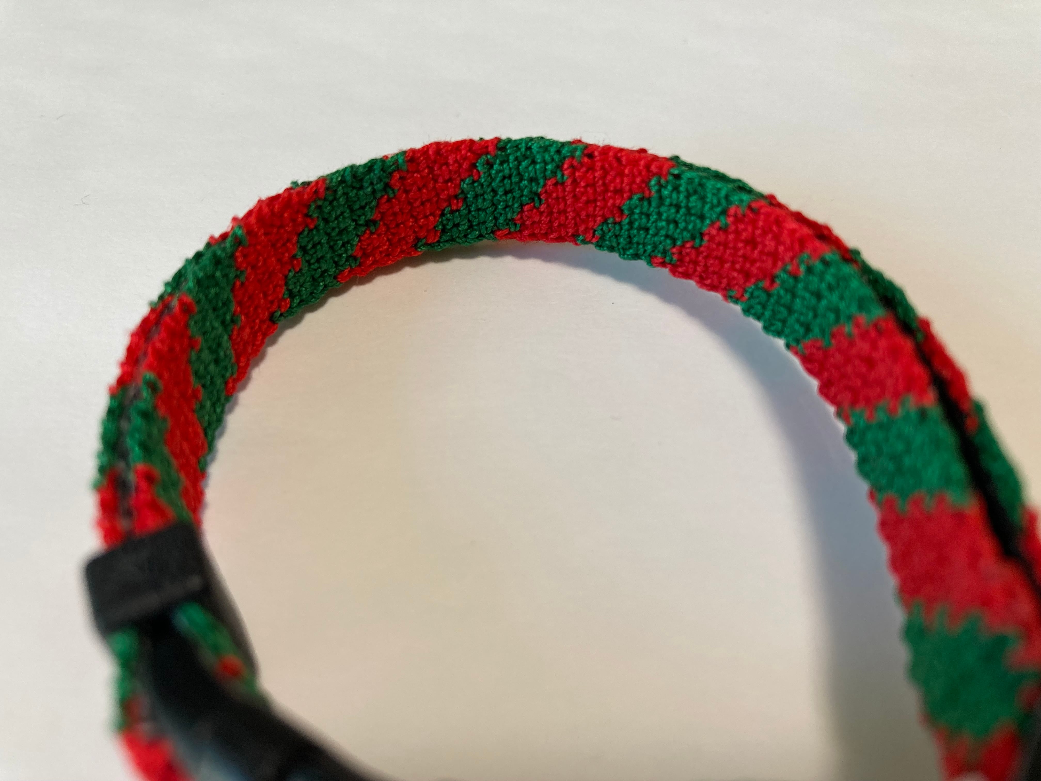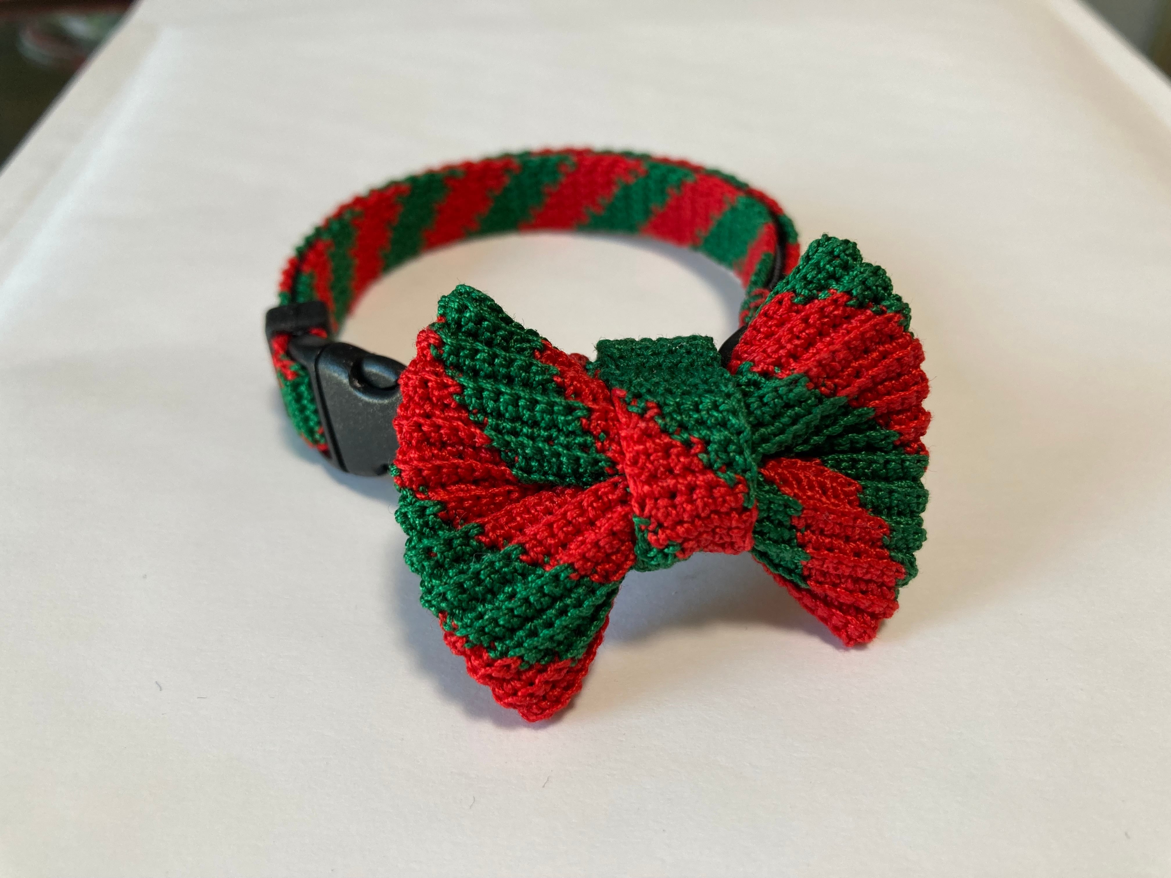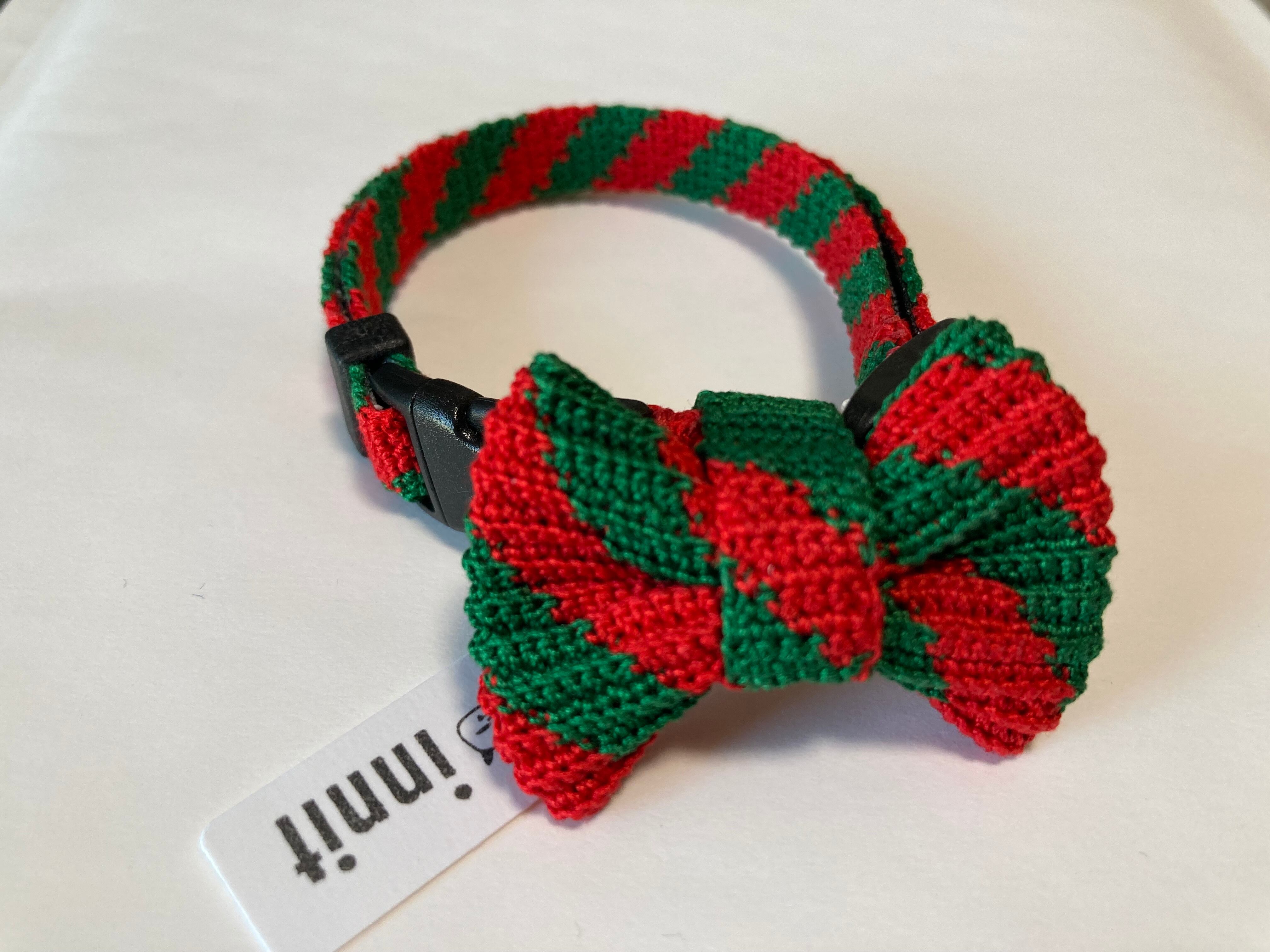 クリスマスシーズンにぴったりな斜めボーダーデザインが特徴で、愛猫のスタイルを華やかに演出します。デザインに使用されている色合いは、クリスマスの楽しさを引き立て、特別な日の装いに最適です。レース糸を用いて、一目一目丁寧に編んでおり、爪が引っ掛かる心配も少ないです。また、表地も裏地もしっかりとしており、丈夫で伸びにくい仕様になっています。軽さと適度な柔らかさにより、ネコさんにかかる負担を極力抑えて作成しております。
