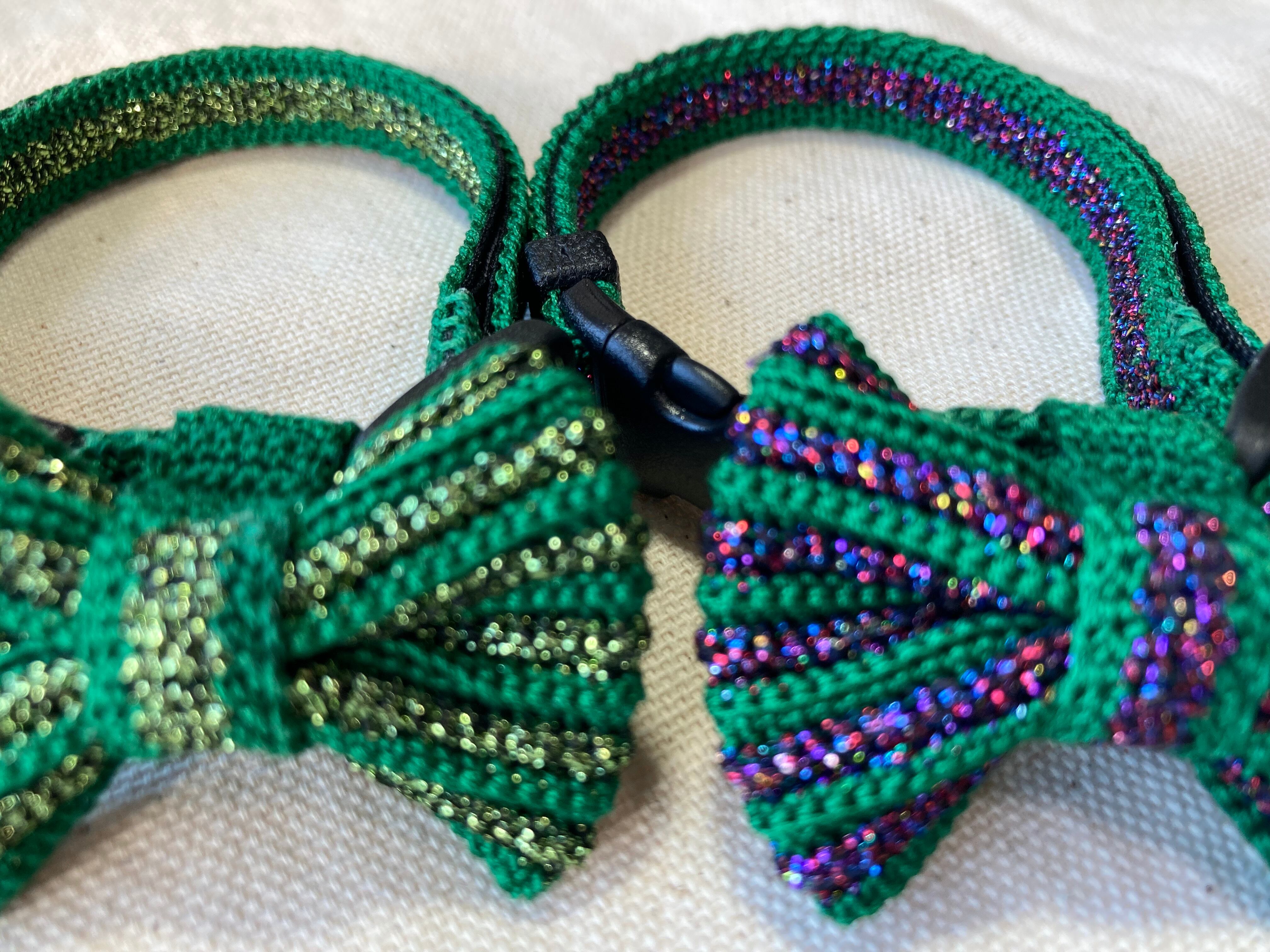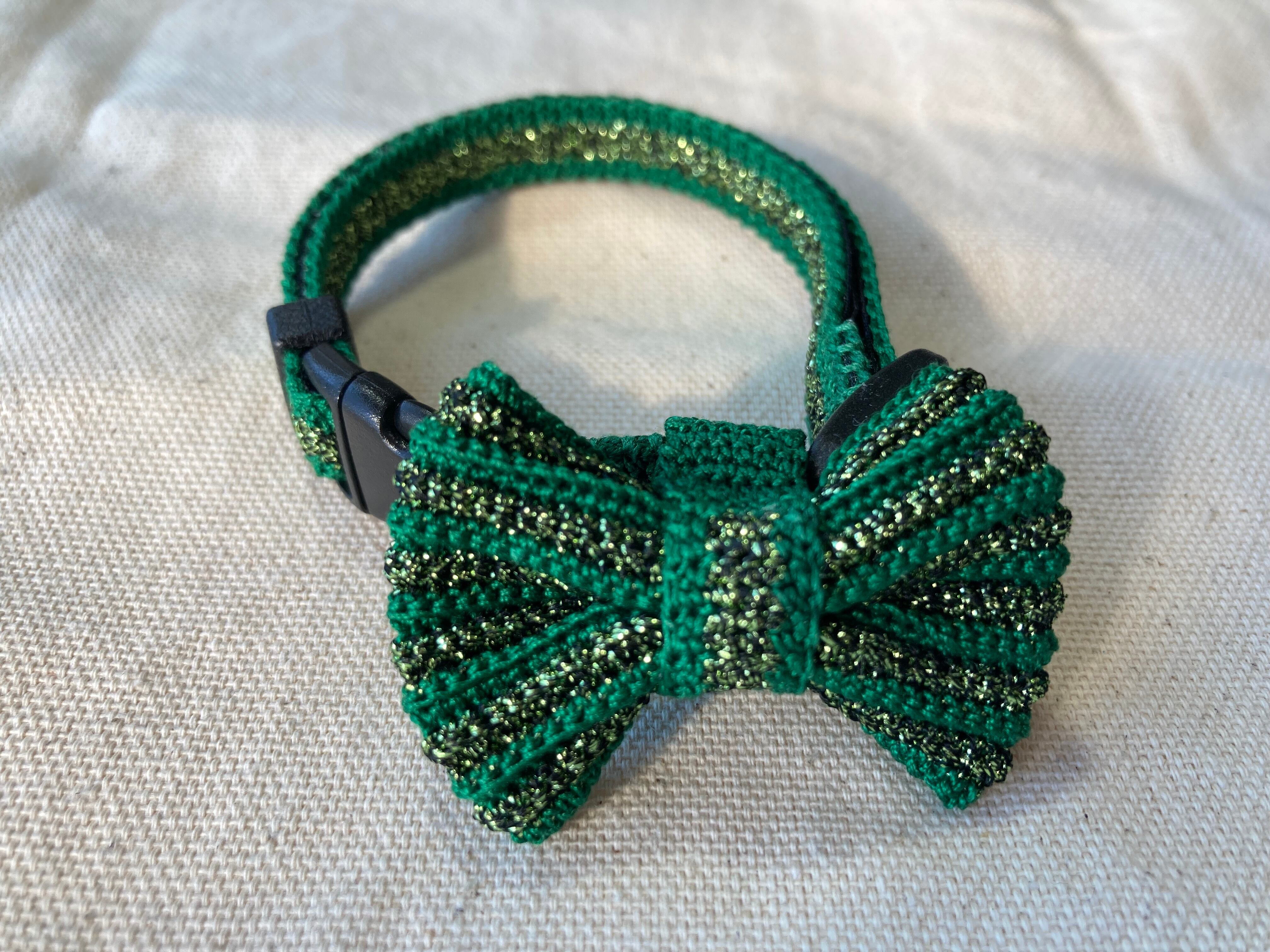 キュートでおしゃれなねこさんの首輪をご紹介します。クリスマスカラーのグリーンに、高級感のあるゴールドのグリッターがきらめくデザインです。ねこさんのネクタイをイメージした可愛らしいデザインなので、イベントや写真撮影時にぴったりです。