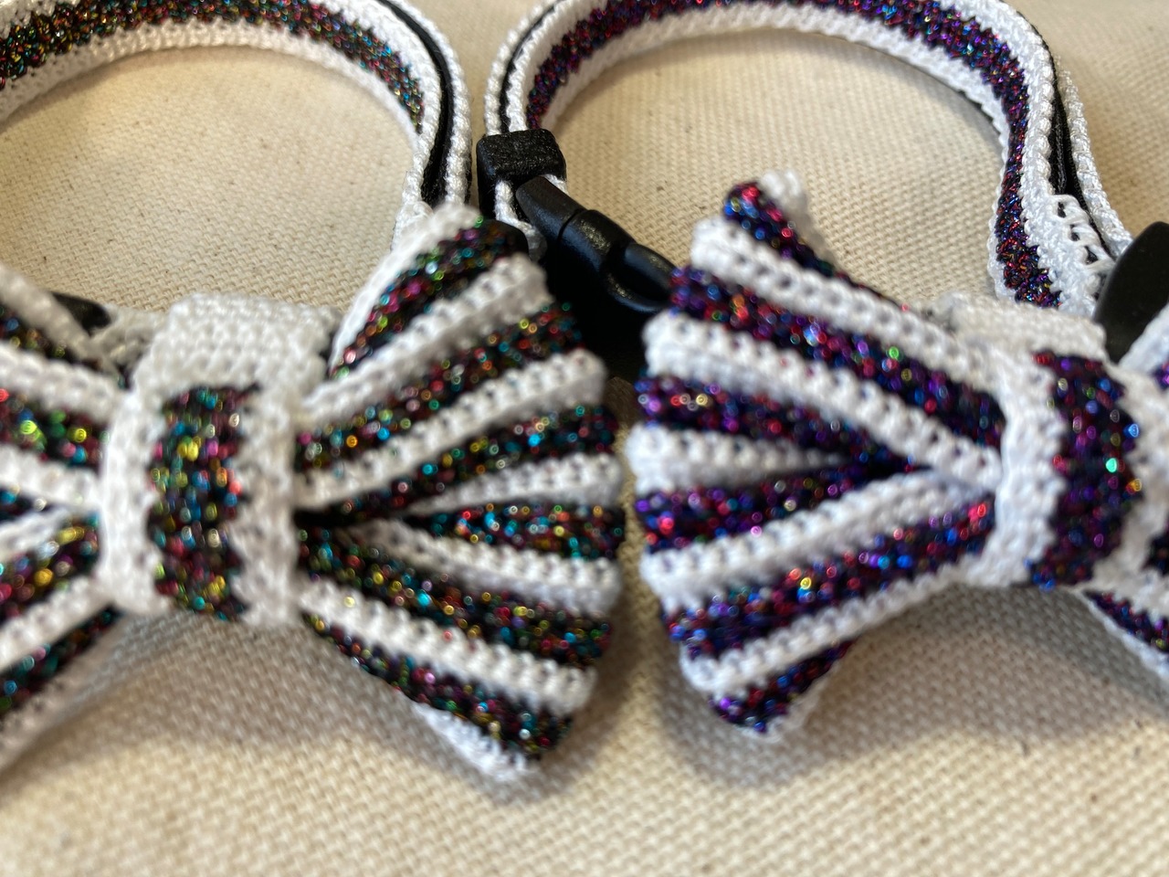 可愛いねこさんもクリスマス仕様に!白とブリティッシュグリッターミックスの2色使いがとっても華やかなねこさん首輪です。パーティーやイベントにぴったりのアクセントアイテムですよ。